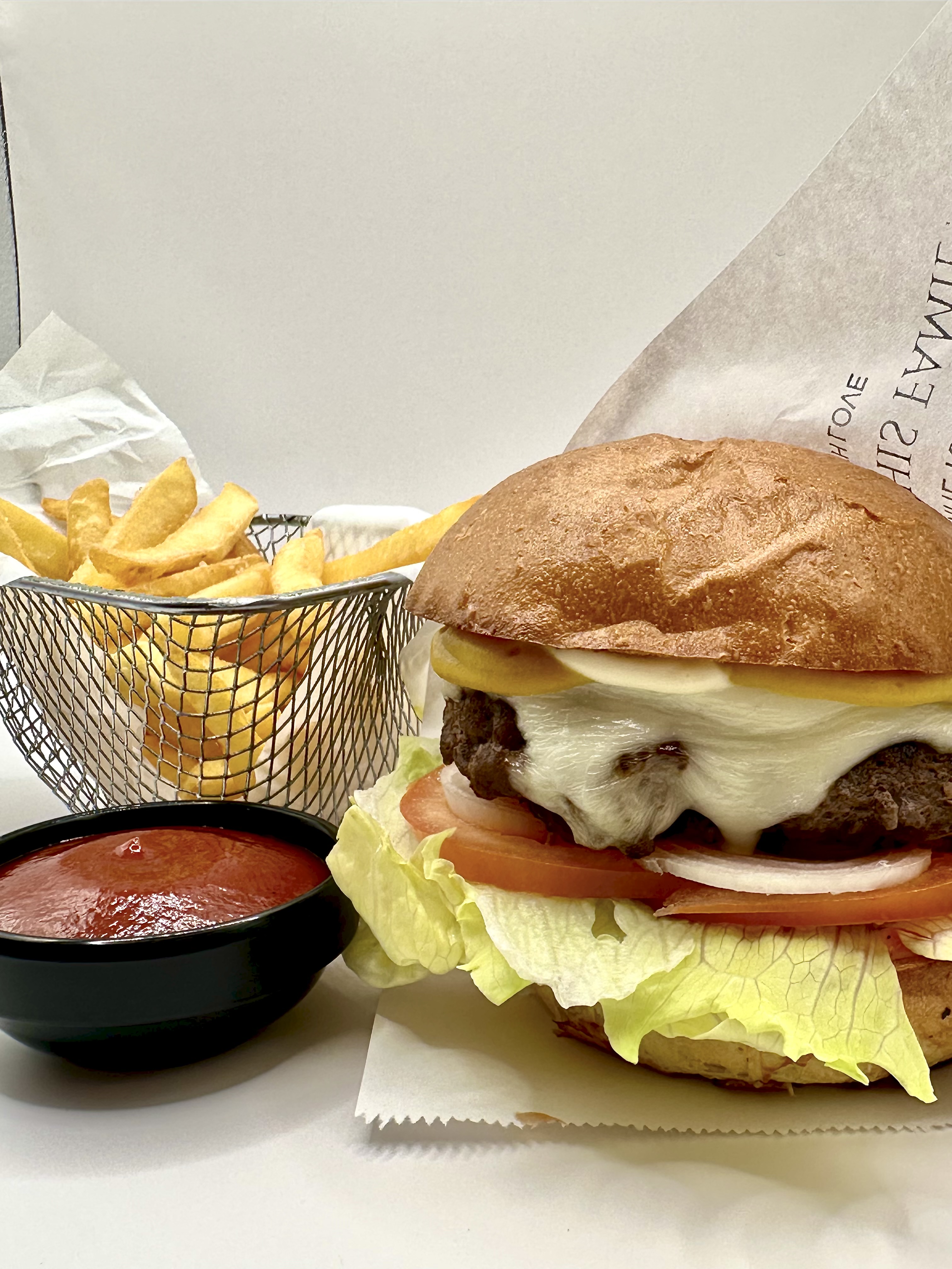 Бургер із телятиною, айзберг, цибуля, солений огірок, помідор, американська гірчиця, майонез, кетчуп, картопля фрі. (330гр)